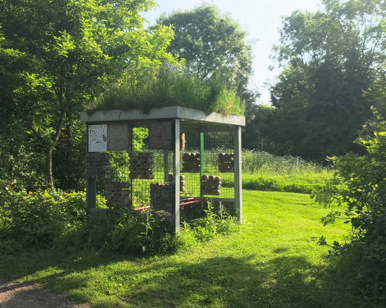 Although there are other green roofs on the site the final review is of a bin shelter. This is one of the modular green roof buildings provided by GRS. In fact, it is a complete habitat building. This particular one was produced for a show garden and has resided at Hilldrop for the last three years. Whilst the green roof is blooming with flax the bee walls/hotels are packed full of resin and other solitary bees.